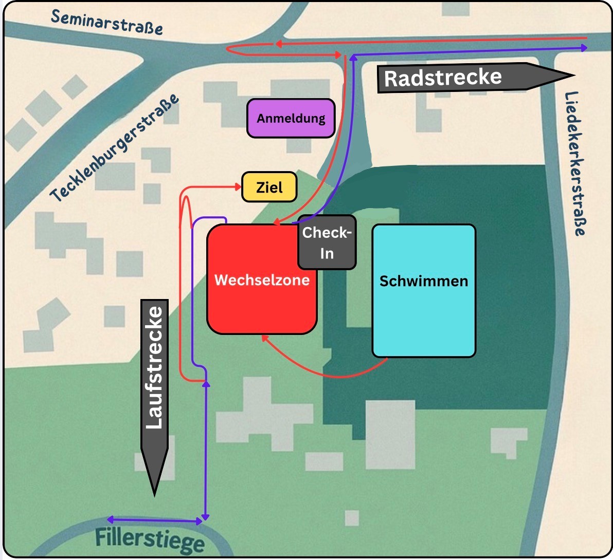 - Strecken- und Zielverpflegung (1 Verpflegungsposten auf der Radstrecke für die Mitteldistanz/ 2 Verpflegungsposten auf der Laufstrecke)